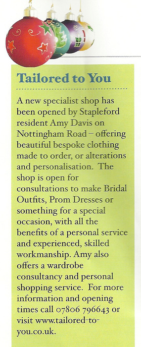 We have opened our new studio on Stapleford high street. Why don't you give us a call about your alteration or new fabulous outfit or come down and see us.